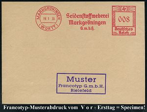 4124 | 35 € | POSTLEITRAUM 7100 (OHNE HEILBRONN u. LUDWIGSBURG) : MARKGRÖNINGEN/ (WÜRTT)/ Seidenstoffweberei/ Markgröningen/ GmbH 1935 (19.1.) AFS-Musterabdruck Francotyp "Hakenkreuz" , glasklar gest. Francotyp-Musterblatt vom V o r - Ersttag! (mit Attest), selten! (Dü.E-3CEo) | ![]() ![]() | |