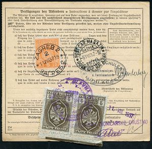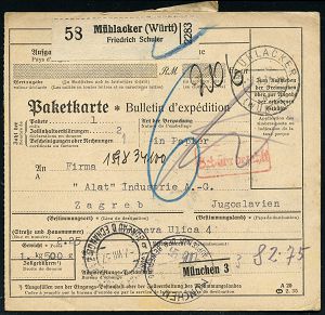 4136 | 28 € | POSTLEITRAUM 7100 (OHNE HEILBRONN u. LUDWIGSBURG) : MÜHLACKER/ a/ (WÜRTT) 1937 (3.8.) 2K-Steg + roter Ra.: Nachgebühr bezahlt + schw. Selbstbucher-Paketzettel: Mühlacker (Württ)/ Friedrich Schuler + div. TS., Ausl.-Selbstbucher-Paketkarte n. Zabgreb, rs. jogoslaw. Porto- u. Fiskalmarken | ![]() ![]() | |