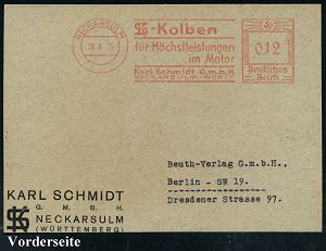 4144 | 15 € | POSTLEITRAUM 7100 (OHNE HEILBRONN u. LUDWIGSBURG) : NECKARSULM/ KS-Kolben/ für Hochleistungen/ im Motor/ Karl Schmidt GmbH.. 1935 (30.8.) AFS Francotyp "Hakenkreuz" (Monogr.-Logo) motivgl. Firmen-Vorderseite (Dü.E-3CEo) | ![]() | |