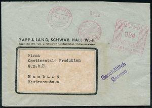 4171 | 35 € | POSTLEITRAUM 7100 (OHNE HEILBRONN u. LUDWIGSBURG) : SCHWÄBISCH HALL/ Gutes Fischttranfestt/ Zapf & Lang GmbH 1946 (13.9.) AFS Francotyp "Mäanderrechteck" unverändert weiterverwendet mit Inschrift "DEUTSCHES REICH" = Notmaßnahme! (Hochseefisch) zweitbedingt etw. schwach auf Firmen-Bf.: ZAPF & LANG.. Oel- u. Fettfabrik, Harzdestillation, Fichtenpechsiederei (Dü.E-2CEh, unverändert) | ![]() | |