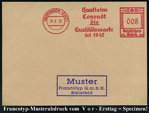 4179 | 35 € | POSTLEITRAUM 7100 (OHNE HEILBRONN u. LUDWIGSBURG) : VAIHINGEN (ENZ)/ Hautleim/ Conradt/ die/ Qualitätsmarke/ seit 1842 1935 (24.5.) AFS-Musterabdruck Francotyp "Hakenkreuz" , glasklar gest. Francotyp.Musterblatt vom V o r - Ersttag! (mit Attest), selten! (Dü.E-3CEo) | ![]() ![]() | |