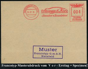 4180 | 35 € | POSTLEITRAUM 7100 (OHNE HEILBRONN u. LUDWIGSBURG) : VAIHINGEN (FILDERN)/ Stumpp & Kurz/ Schrauben-u.Fassondreherei 1936 (23.12.) AFS-Musterdruck Francotyp "Reichsadler" , glasklar gest. Francotyp-Musterblatt vom V o r - Ersttag! (mit Attest), selten! (Dü.E-5CGo) | ![]() ![]() | |