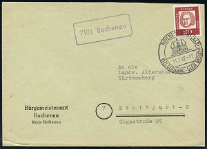 3995 | 14 € | POSTLEITRAUM 7100 (OHNE HEILBRONN u. LUDWIGSBURG) : 7101 Bachenau 1962 (11.7.) viol. Ra. = PSt.II + aptierter HWSt: HEILBRONN (NECKAR)/VIEL GERÜHMT.. = alte PLGZ entfernt! , Dienst-Bf.: Bürgermeisteramt Bachenau (Bo.21 aptiert) | ![]() | |