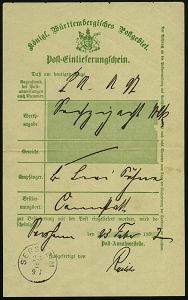 4174 | 14 € | POSTLEITRAUM 7100 (OHNE HEILBRONN u. LUDWIGSBURG) : SERSHEIM 1897 (23.2.) 1K auf grünem "Post=Einlieferungsschein" (Kgl.Württbg. Postgebiet mit Landeswappen) mit Plattenfehler "Fehlstelle in grünen Feld" (gefaltet) | ![]() | |