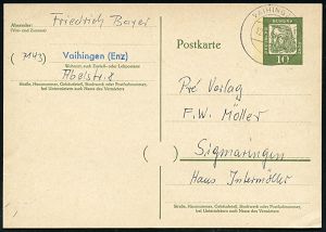 4181 | 10 € | POSTLEITRAUM 7100 (OHNE HEILBRONN u. LUDWIGSBURG) : VAIHINGEN (ENZ)/ a 1962 (12.7.) aptierter 2K-Steg = alte PLGZ entfernt klar auf Inl.-P 10 Pf. Dürer mit Abs. u. neue PLZ ! (Mi.P 67) | ![]() | |