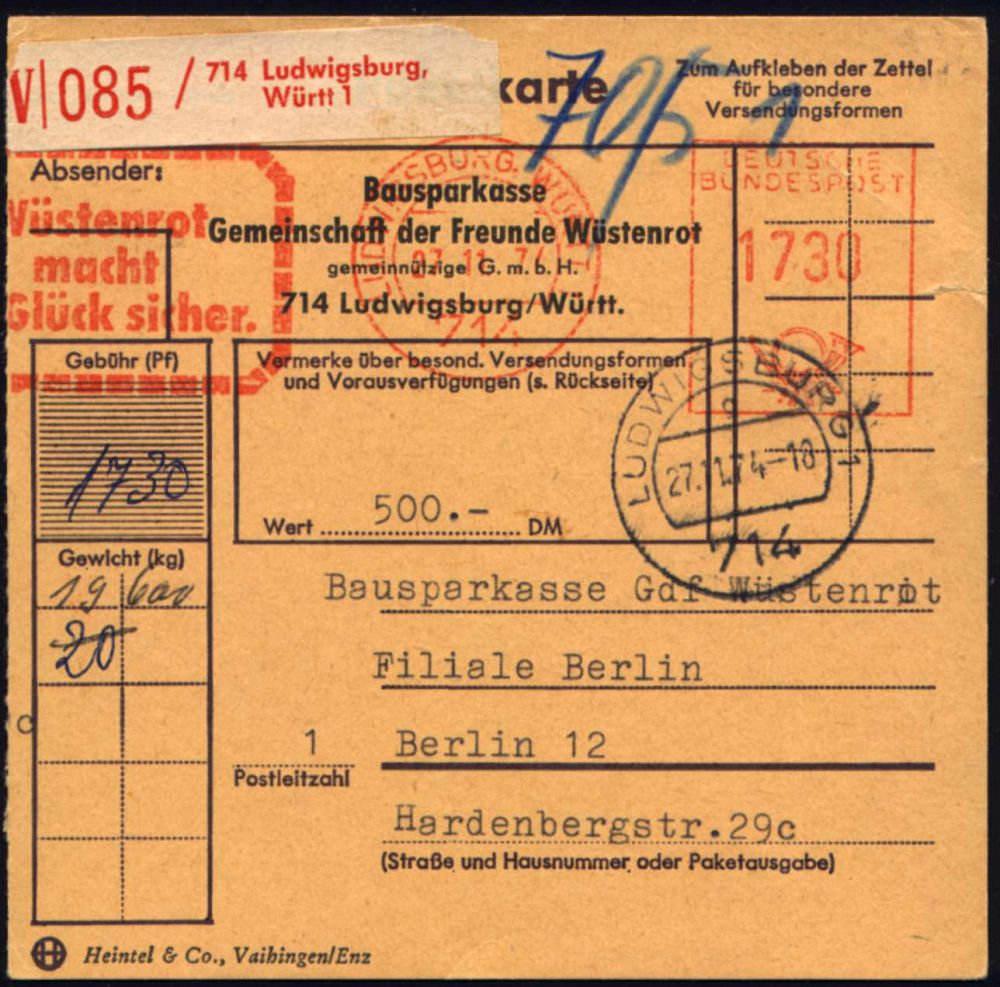 4112 | 16 € | 7140 LUDWIGSBURG : 714 LUDWIGSBURG WÜRTT 1/ Wüstenrot/ macht/ Glück sicher 1974 (27.11.) AFS Francotyp "Posthorn" 1730 (Pf.) = Bausparkasse + roter Wertpaketzettel: 714 Ludwigsburg,/Württ 1, Inl.-Wertpaketkt. 500.- DM, seltenes Porto! (Dü.E-26) | ![]() | |