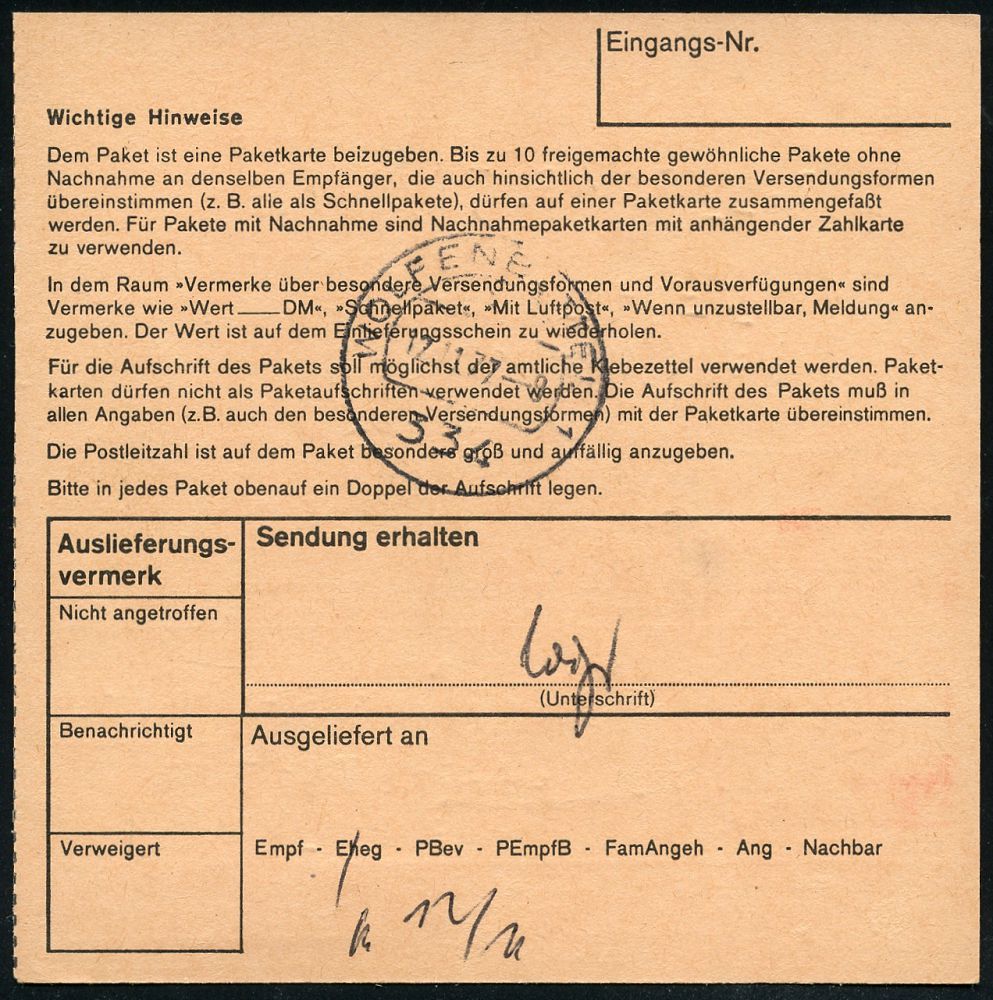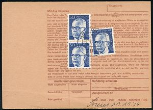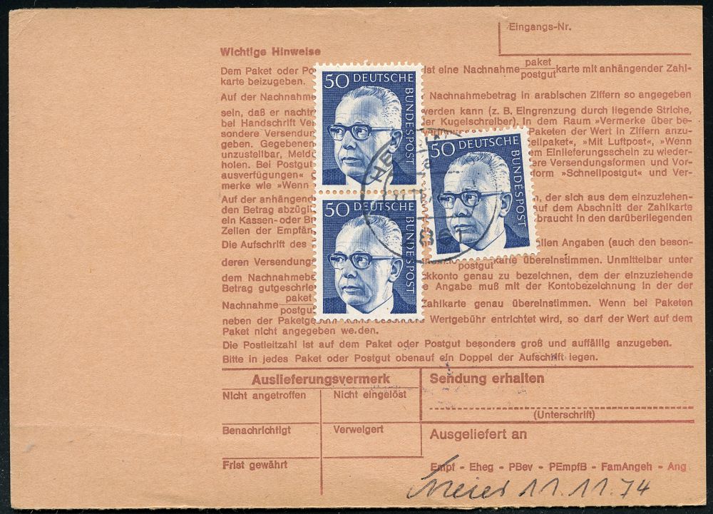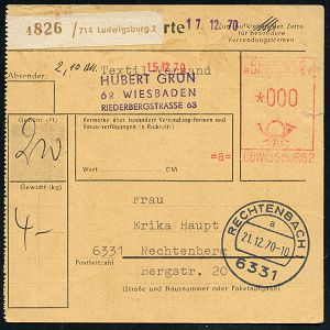 4111 | 15 € | 7140 LUDWIGSBURG : =a= LUDWIGSBURG 2 1970 (15.12.) Paket-PFS Francotyp "Posthorn" *000 (Pf.) + brauner Paketzettel: 714 Ludwigsburg 2 , unfreie Inl.-Paketkarte n. Rechtenbach, vs. AS. (Dü.H-6C) | ![]() | |