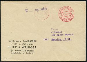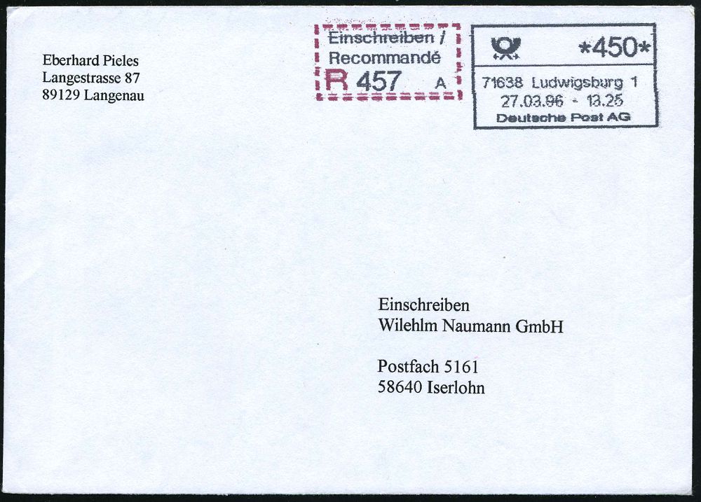 4116 | 25 € | 7140 LUDWIGSBURG : 71638 Ludwigsburg 1/ ..Deutsche Post AG 1996 (27.3.) ABBAS-Münz-Postfreistemel *450* (Pf.) + roter Zusatz-Ra.: Einschreiben/ Recommandé.. (schw.-rot) seltener Inl.-R-Bf., Versuchs-Automat, nur kurze Verwendungszeit! (= IBM-Drucker) | ![]() | |