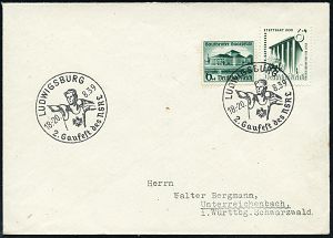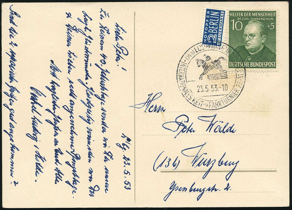4078 | 25 € | 7140 LUDWIGSBURG : (14a) LUDWIGSBURG/ INTERNAT.REIT-U:FAHRTURNIER 1953 (23.5.) seltener HWSt = Springreiter (an der Mauer) auf EF 10 + 5 Pf. Wofa (Mi.157, EF, + 20.-EUR) Bedarfs-Karte (Bo.15) | ![]() | |