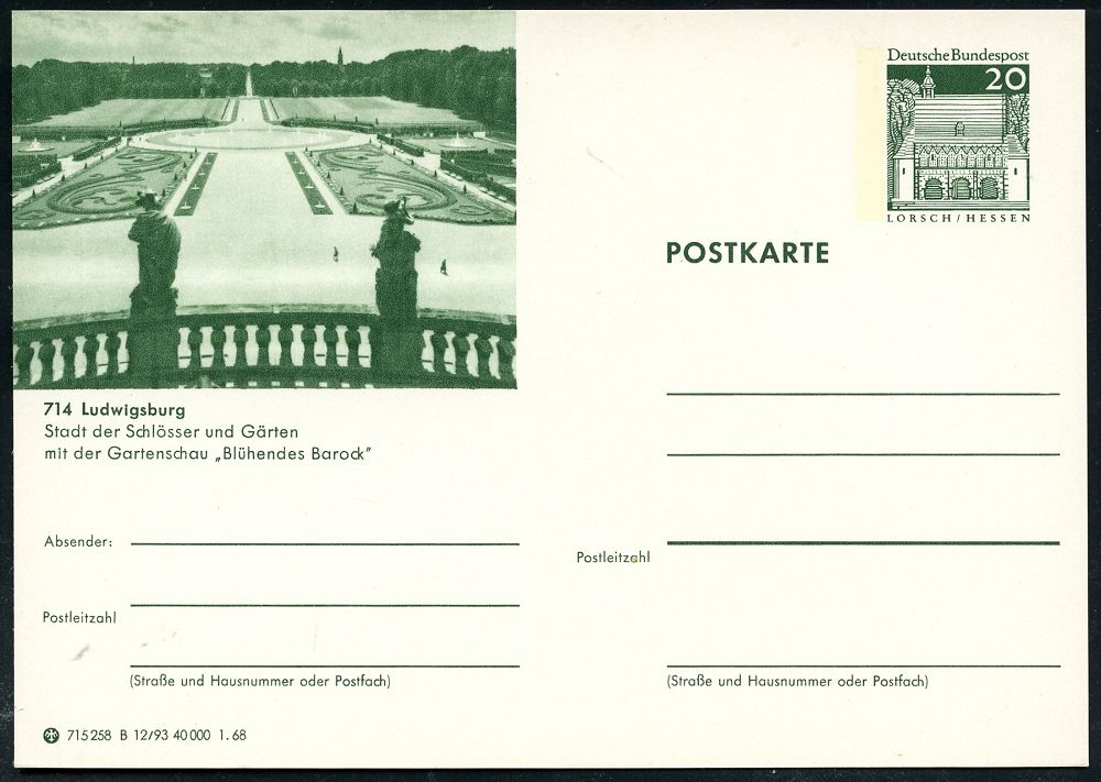 4086 | 12 € | 7140 LUDWIGSBURG : 714 Ludwigsburg 1968 20 Pf. BiP Lorsch, grün: Barock-Gärten u. Schloß (Barockschloß, Garten) 3 verschied. Varianten, je ungebr., 3 Belege (Mi.P 96-B 12/93 bis 95) | ![]() ![]() ![]() | |