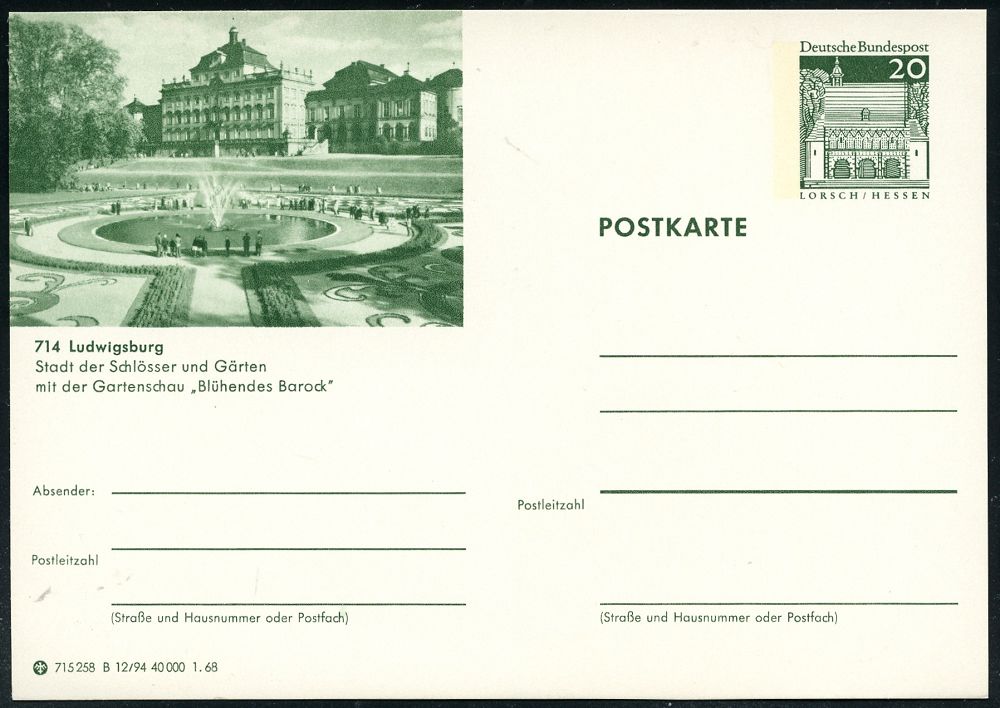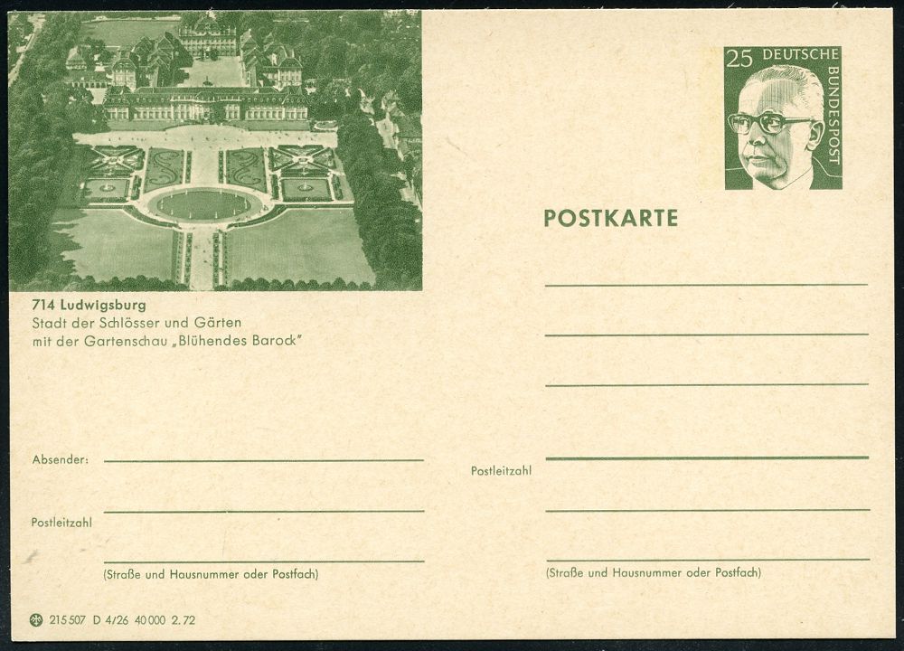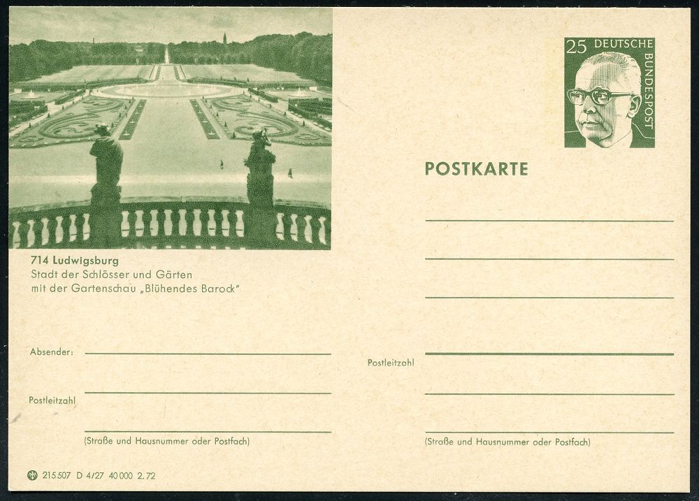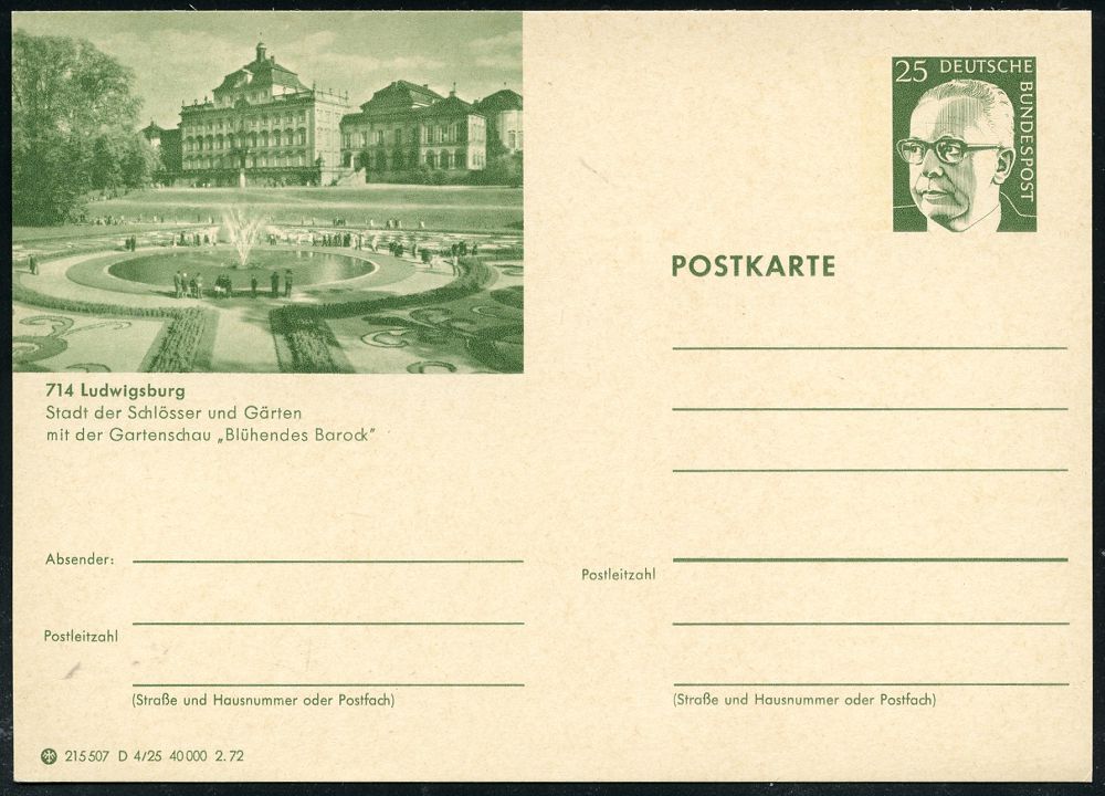 4088 | 12 € | 7140 LUDWIGSBURG : 714 Ludwigsburg 1972 25 Pf. BiP Heinemann, grün: Schloß u. Barock-Garten, 3 verschiedene Bilder , je ungebr., 3 Belege (Mi.P 109/25 bis 27) | ![]() ![]() ![]() | |