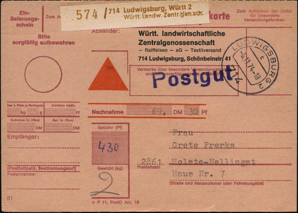 4089 | 14 € | 7140 LUDWIGSBURG : 714 LUDWIGSBURG 2/ c 1974 (6.11.) 1K-Segment + brauner S e l b s t b u c h e r - Paketzettel: 714 Ludwigsburg, Württ 2/Württ. Landw. zentr. gen. sch. , klar gest. Inl.-Selbstbucher-NN-Paketkt | ![]() ![]() | |
