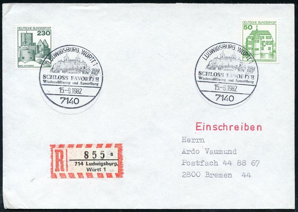 4092 | 16 € | 7140 LUDWIGSBURG : 7140 LUDWIGSBURG,WÜRTT 1/ SCHLOSS FAVORITE/ Wiedereröffnung.. 1982 (15.8.) SSt (Schloß Favorite) 2x + RZ: 714 Lufwigsburg,/Württ 1/a, klar gest. Inl.-R-Bf.! (Bo.62) | ![]() | |