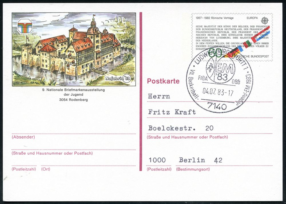 4093 | 6 € | 7140 LUDWIGSBURG : 7140 LUSWIGSBURG,WÜRTT 1/ EM´83/ FIBA DBB/ VII.Basketball-Jugend-EM 1983 (4.7.) SSt (Ball) klar gest. Inl.-Karte (Bo.65) | ![]() | |