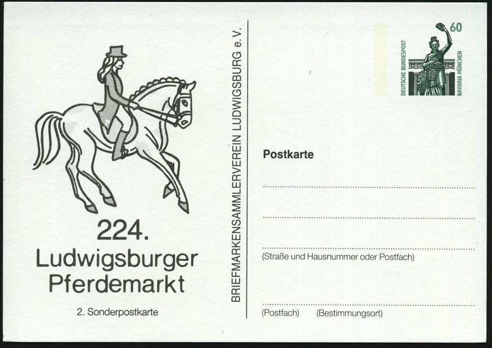 4095 | 10 € | 7140 LUDWIGSBURG : Ludwigsburg 1992 PP 60 Pf. Bavaria, grün: 224. Ludwigsburger Pferdemarkt = Dressur-Reiterin , ungebr. (Mi.PP 151) | ![]() | |