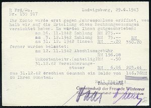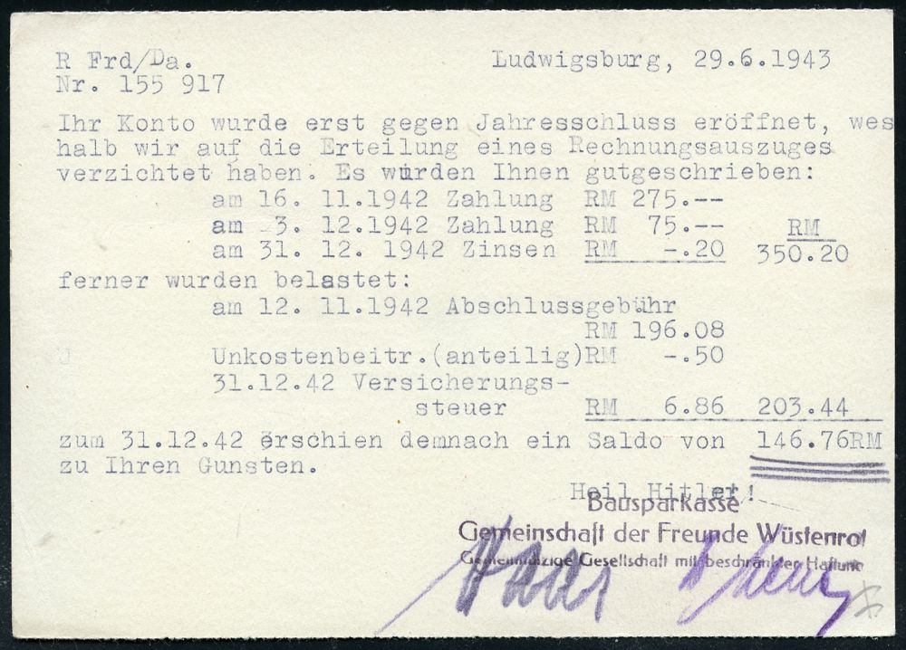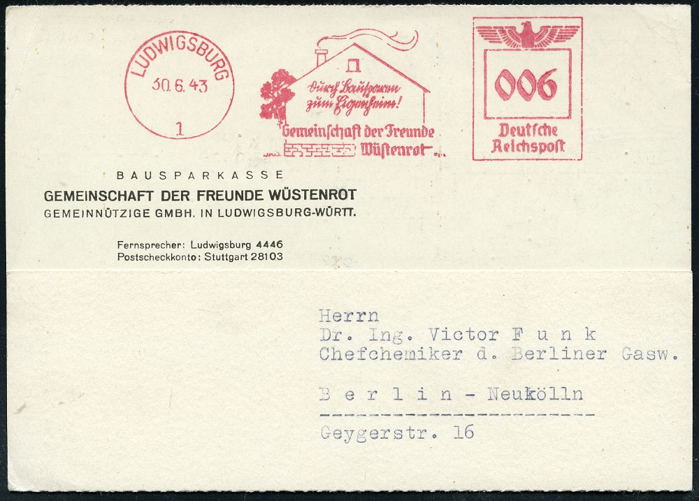 4102 | 18 € | 7140 LUDWIGSBURG : LUDWIGSBURG/ 1/ durch Bausparen/ zum Eigenheim!/ Gemeinschaft der Freunde/ Wüstenrot 1943 (30.6.) AFS Francotyp "Reichsadller", teils Sütterlin (Einfamilienhaus) Firmen-Kt.: (Dü.E-5BAo) | ![]() ![]() | |