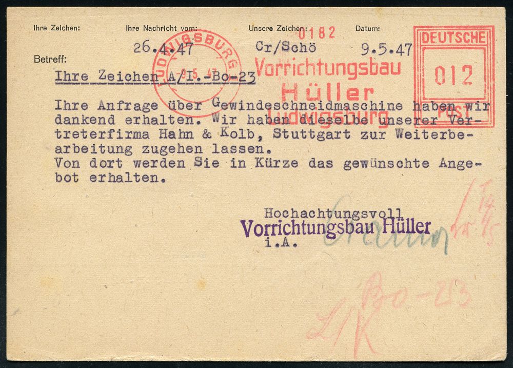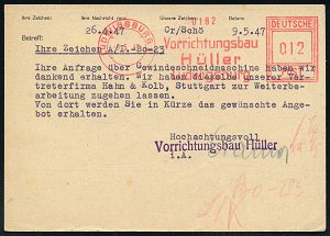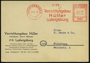 4107 | 20 € | 7140 LUDWIGSBURG : LUDWIGSBURG 1/ Vorrichtungsbau/ Hüller.. 1947 (9.5.) seltene AFS-Typ Francotyp "Hochrechteck" 012 Pf. auch irrtümlich rückseitig angebracht! , Firmen-Fern-Kt. (Dü.E-18CGh maximal 1 1/2 Jahre = Vorläufer E-22) | ![]() ![]() | |