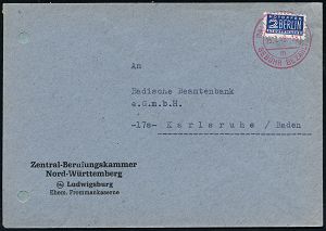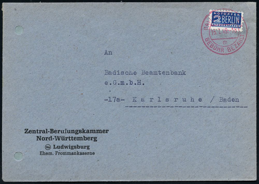 4110 | 18 € | 7140 LUDWIGSBURG : (14) LUDWIGSBURG/ m/ GEBÜHR BEZAHLT 1949 (15.7.) 2K-Steg-PFS mit Uhrzeit auf EF 2 Pf. NoB (Nr.2 AZ) Dienst-Bf. (Reg.-Lochung geschl.): Zentral-Berufungskammer Nord-Württemberg = für Entnazifizierungsverfahren n. Karlsruhe, Zeitgeschichte! (Dü.A-7, Nr.28) | ![]() | |