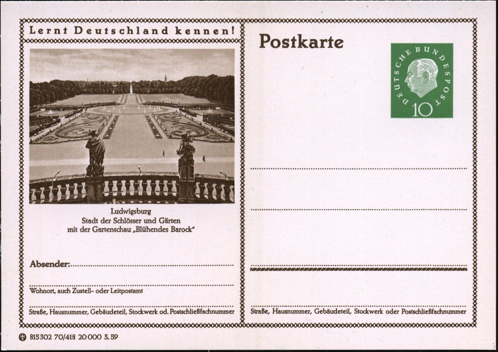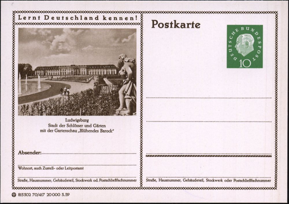 4079 | 15 € | 7140 LUDWIGSBURG : Ludwigsburg 1959 10 Pf. BiP Heuss III, grün: Schloß u. Barock-Garten, 3 verschiedene Varianten , je ungebr., 3 Belege (Mi.P 41/417-19) | ![]() ![]() ![]() | |