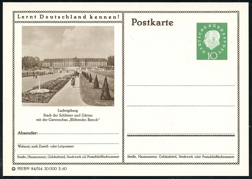 4080 | 15 € | 7140 LUDWIGSBURG : Ludwigsburg 1960 10 Pf. BiP Heuss III, grün: Schloß u. Barock-Garten in 3 Varianten , je ungebr. 3 Belege (Mi.P 42/512-14) | ![]() ![]() ![]() | |