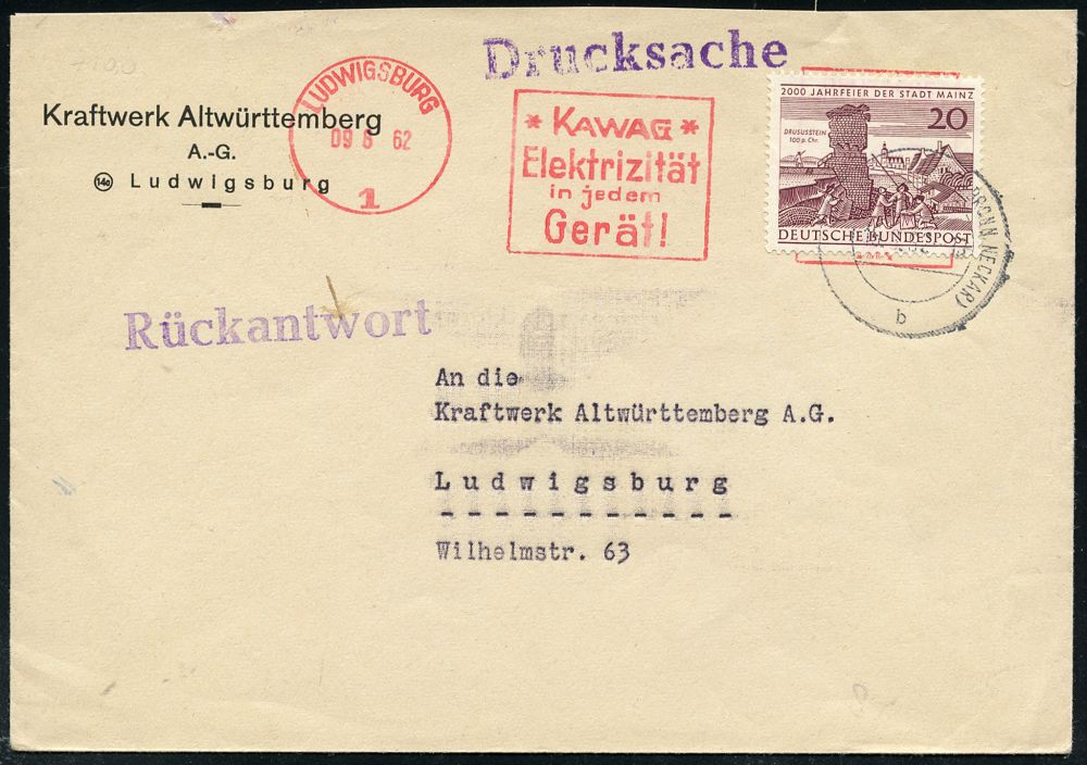 4082 | 18 € | 7140 LUDWIGSBURG : LUDWIGSBURG/ 2/ KAWAG/ Elektrizität/ in jedem/ Gerät 1962 (9.8.) AFS Francotyp "Posthorn" ohne PLZ + viol. 1L: Rückantwort , vorausfrankierter Firmen-Antwort-Bf.: Kraftwerk Altwürttemberg AG, irrtümlich frankiert mit EF 20 Pf. "2000 Jahre Mainz" (Mi.375 EF) (Dü.E-23) | ![]() | |