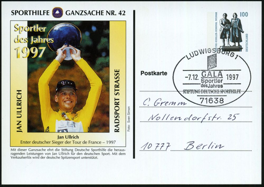 4096 | 10 € | 7140 LUDWIGSBURG : 71638 LUDWIGSBURG 1/ ARD/ Sporler/ des Jahres.. 1997 (7.12.) SSt auf PP 100 Pf. Goethe/Schiller: Sportler des Jahres ..JAN ULLRICH (Ullrich mit Pokal "Tour de France" 1997) Inl.-Kt. = Olympiade 2000 Gold Straßenrennen, Silber Zeitfahren (Mi.PP 156) | ![]() | |