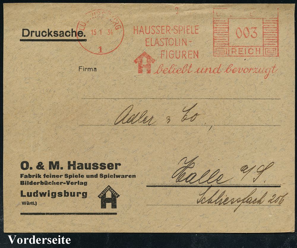 4098 | 14 € | 7140 LUDWIGSBURG : LUDWIGSBURG/ 1/ HAUSSER-SPIELE/ ELASTOLIN-/ FIGUREN:: 1934 (15.1.) AFS Francotyp "Mäanderrechteck" (oben etw. undeutl.) mit Firmen-Logo, motivgl. Firmen-Vorderseite = Hersteller der berühmten Elastolin-Soldaten (Dü.E-2CE) | ![]() | |