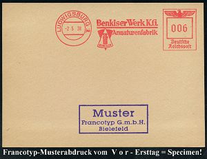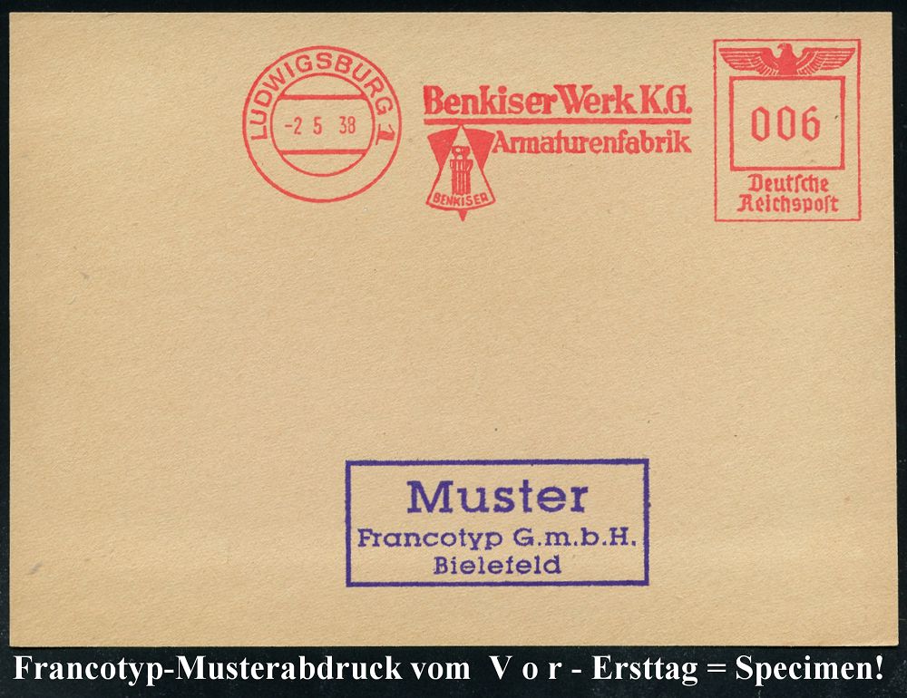 4100 | 35 € | 7140 LUDWIGSBURG : LUDWIGSBURG 1/ Benkiser Werk KG/ Armaturfabrik 1938 (2.5.) AFS-Musterabdruck Francotyp "Reichsadler" (Firmen-Logo mit Druckknopf) glasklar gest. Francotyp-Musterblatt vom V o r - Ersttag! (mit Attest), selten! (Dü.E-5CGo) | ![]() ![]() | |