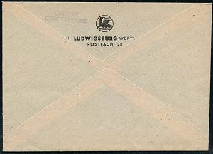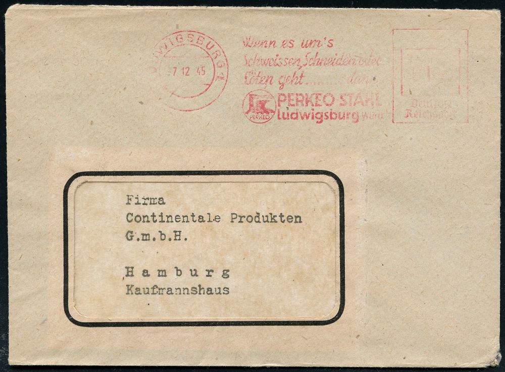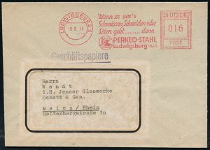4103 | 25 € | 7140 LUDWIGSBURG : LUDWIGSBURG 1/ Wenn es ums´s/ Schweissen,Schneiden oder / Löten geht/ PERKEO STAHL.. 1945 (12.7.) aptierter AFS Francotyp "Reichsadler" = entfernt = Notmaßnahme! (Logo: feuerspeiender Drache) rs. motivgl. Firmen-Logo) AFS zeitbedingt etwas schwach, sehr früher Nachkriegs-Fern-Bf.!, vergl. Kat.Nr.4106 (Dü.E-13 J-129o) | ![]() ![]() | |