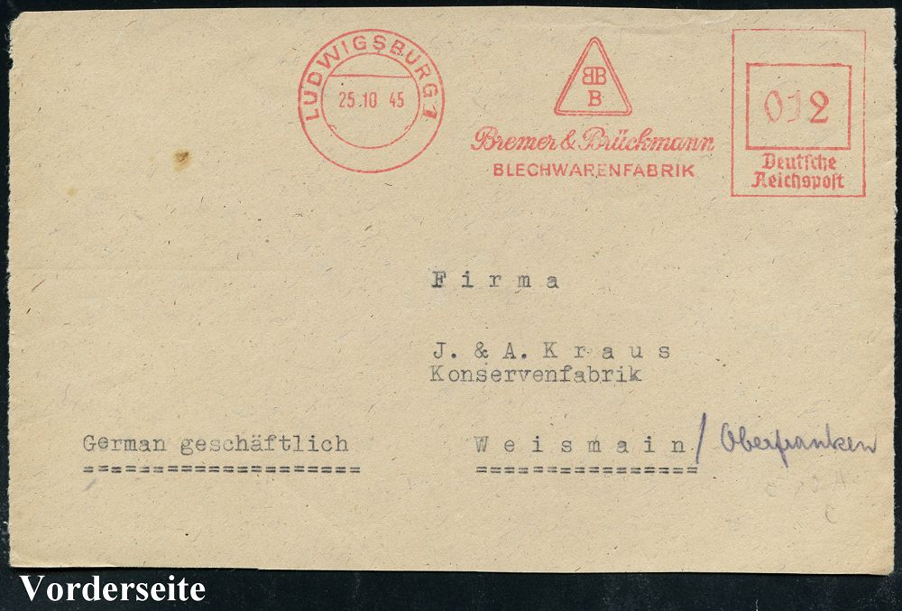 4104 | 18 € | 7140 LUDWIGSBURG : LUDWIGSBURG 1/ BBB/ Bremer & Brückmann/ BLECHWARENFABRIK 1945 (25.10.) aptierter AFS Francotyp "Reichsadler" = entfernt = notmaßnahme! (Monogr.-Logo) Bedarfs-Vorderseite (Dü.E-13 J-127o) | ![]() | |