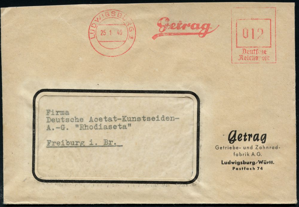 4105 | 22 € | 7140 LUDWIGSBURG : LUDWIGSBURG 1/ Getrag 1946 (25.1.) aptierter AFS Francotyp "Reichsadler" = entfernt = Notmaßnahme! , Firmen-Bf.: Getrag, Getriebe- u. Zahnradfabrik AG.. (Dü.E-13 J-129o) | ![]() | |