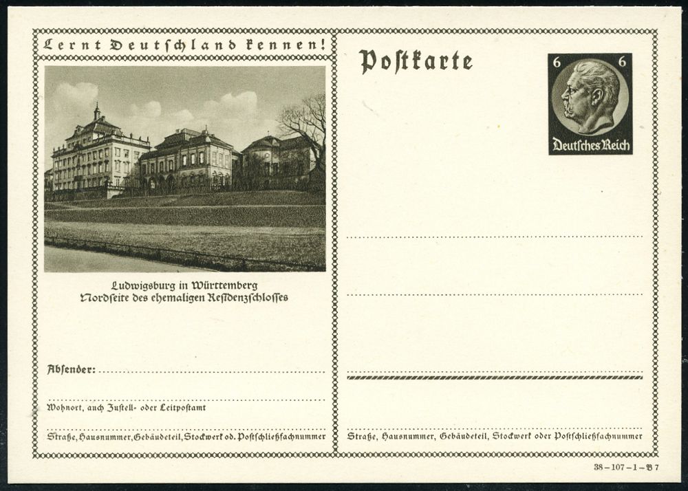4072 | 10 € | 7140 LUDWIGSBURG : Ludwigsburg 1938 6 Pf. BiP Hindenburg, braun: Residenzschloß , ungebr. (Mi.P 236-38-107-B 7) | ![]() | |