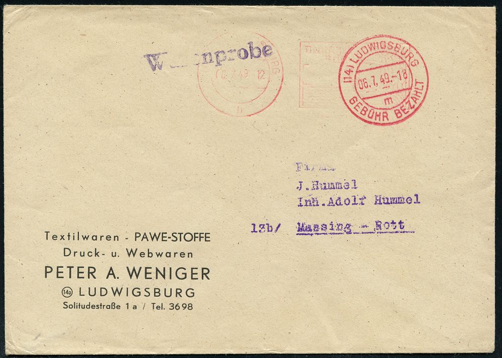4109 | 18 € | 7140 LUDWIGSBURG : (14) LUDWIGSBURG/ m/ GEBÜHR BEZAHLT 1949 (6.7.) 2K-Steg-PFS mit Uhrzeit + irrtümlich r o t e r Tagesstempel (2K etw. schwach) Firmen-Bf.: Textilwaren.. PETER A. WENIGER.. (Dü.A-7, Nr.28) | ![]() | |
