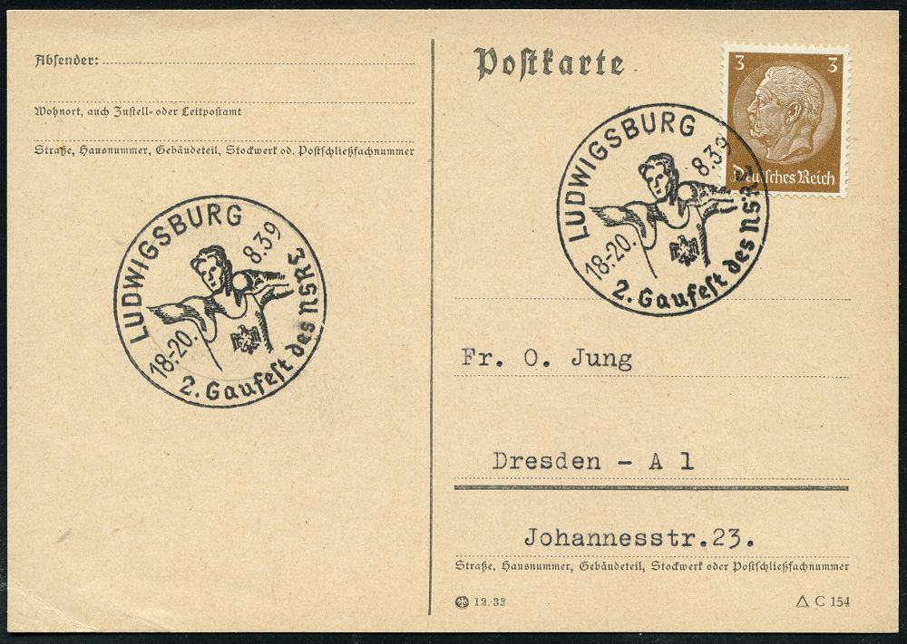 4074 | 14 € | 7140 LUDWIGSBURG : LUDWIGSBURG/ 2.Gaufest des NSRL 1939 (Aug.) SSt (Kugelstoßer) 2x glasklar auf Inl.-Karte. (Bo.6) | ![]() | |