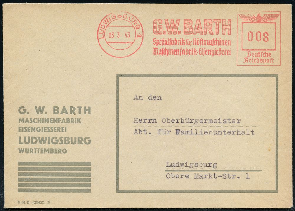 4101 | 20 € | 7140 LUDWIGSBURG : LUDWIGSBURG 1/ G.W.BARTH/ Spezialfabrik für Röstmaschinen/ Maschinanfabrik-Eisengießerei 1943 (3.3.) seltener AFS Francotyp "Reichsadler" klar auf Firmen-Orts-Bf. (Dü.E-5CG) | ![]() | |