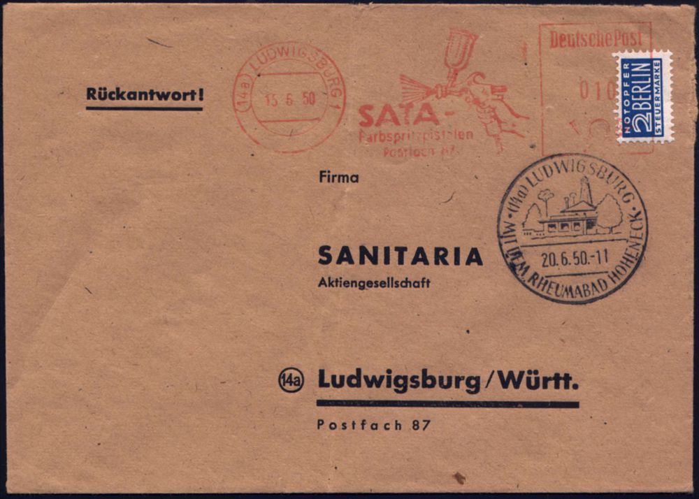 4077 | 18 € | 7140 LUDWIGSBURG : (14a) LUDWIGSBURG 1/ SATA/ Farbspritzpistolen.. 1950 (15.6.) AFS 10 Pf. (Hand mit Farbspritzpistole) auf 2 Pf. NoB = VE vorausfrankierter Orts-Antwort-Bf. vorschriftsmässig mit Aufgabe-HWSt.: (14a) LUDWIGSBURG/ MIT DEM RHEUMABAD HOHENECK (Bo.13, Erstjahr) vom 20.6. (Dü.E-20 Po) | ![]() | |