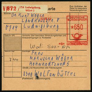 4113 | 15 € | 7140 LUDWIGSBURG : =a= LUDWIGSBURG 2 1977 (11.11.) Paket-FS Francotyp "Posthorn" *650 Pf. + roter Wertpaket-Zettel: 714 Ludwigsburg,/ Württ 2 , (Wert 500.- DM) Inl.-Wertpaketkt. n. Wolfenbüttel, seltene Portostufe (Dü.H-6C) | ![]() ![]() | |