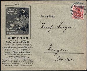 4066 | 18 € | 7140 LUDWIGSBURG : LUDWIGSBURG/ Postamt Nr.1 1908 (7.6.) 1K-Gitter auf Reklame-Bf.: Lerne spielend Geographie.. Müller & Freyer, Jnh. O.M. & E. Hausser/Spielwarenfabrik = Geografie- Puzzle (kl. Frankatur-Mäng.) Fernbf. (Mi.86 I) | ![]() | |