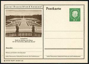 4081 | 15 € | 7140 LUDWIGSBURG : Ludwigsburg 1961 10 Pf. BiP Heuss III, grün: Schloß u. Barock-Gartens in 3 Varianten (mit Skulptur) je ungebr., 3 Belege (Mi.P 53/596-98) | ![]() ![]() ![]() | |