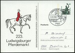 4094 | 14 € | 7140 LUDWIGSBURG : 7140 LUDWIGSBURG,WÜRTT 1/ Ludwigsburger/ Pferdemarkt 1991 (2.6.) SSt = Dressur-Reiter auf motivgl. PP 60 Pf. Bavaria: 223. Ludwigsburger Pferdemarkt (Mi.PP 151) klar gest. Inl.-Kt. | ![]() | |