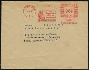 4097 | 20 € | 7140 LUDWIGSBURG : LUDWIGSBURG/ 1/ Zum/ Eigenheim/ durch d./ Bausparkasse/ G.d.F. 1932 (5.4.) AFS Francotyp "Mäanderrechteck" (Haus u. stilis. Münze) Fernbf. (Dü.E-2BAh) | ![]() | |