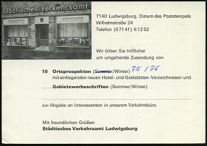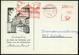 4114 | 14 € | 7140 LUDWIGSBURG : 714 LUDWIGSBURG 1/ STADTVERWALTUNG 1975 (11.9.) AFS Francotyp = Schloß, motiv-ähnl. Kommunal-Kt.: Stadt der Schlösser.. "Blühendes Barock" (rs. Abb. Städt. Verkehrsamt) Inl.-Karte (Dü.E-26) | ![]() ![]() | |