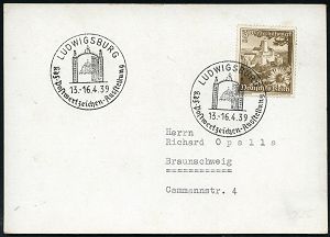 4073 | 14 € | 7140 LUDWIGSBURG : LUDWIGSBURG/ Kdf.-Postwertzeichen-Ausstellung 1939 (Apr.) SSt (Parktor mit Schloß) 2x klar auf Inl.-Karte (Bo.4) | ![]() | |