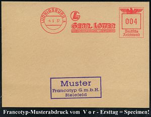 4099 | 35 € | 7140 LUDWIGSBURG : LUDWIGSBURG 1/ GEBR.LOTTER/ EISENGROSSHANDLUNG.. 1937 (4.5.) AFS-Musterabdruck Francotyp "Reichsadler" (Firmen-Logo) glasklar gest. Francotyp-Musterblatt vom V o r - Ersttag! (mit Attest), selten! (Dü.E-5CGo) | ![]() ![]() | |