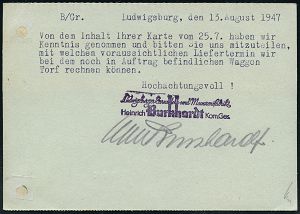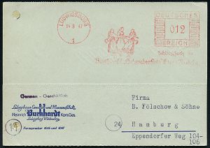 4108 | 20 € | 7140 LUDWIGSBURG : LUDWIGSBURG/ 1/ Schliessfach 85/ .."Schwabenstolz".. 1947 (14.8.) AFS Francotyp "Mäanderrechteck" unverändert weiterverwendet mit Inschrift "DEUTSCHES REICH" (3 tanzende Trachtenfrauen) Inschrift zeitbedingt teils etw. schwach, Firmen-Kt.: Ludwigsburger Eiernudeln- u. Marmeladenfabrik Heinrich Burkhardt KG (Dü.E-2CE unverändert, Spätverwendung) | ![]() ![]() | |