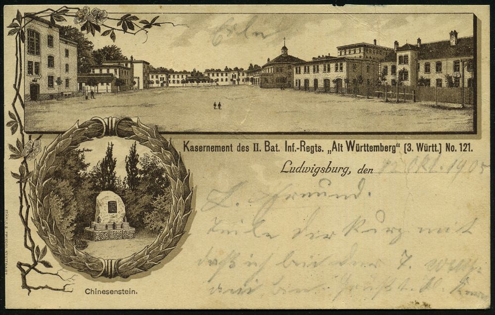 4065 | 16 € | 7140 LUDWIGSBURG : LUDWIGSBURG/ t* 1905 (12.10.) 1K auf monochromer Litho-Ak.: Kasernement des II. Bat. Inf.-Regts. "Alt Württemberg" (3. Württ.) No. 121 = Kaserne u. Chinesenstein (Bugspur u. Randmäng.) dekorative Bedarfs-Kt. (Mi.70) | ![]() ![]() | |