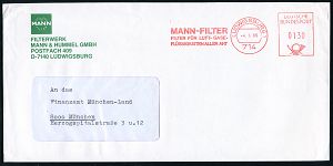 4115 | 10 € | 7140 LUDWIGSBURG : 714 LUDWIGSBURG 1/ MANN-FILTER/ FILTER FÜR LUFT- GASE-/ FLÜSSIGKEITEN ALLER ART 1986 (4.6.) AFS Postalia "Posthorn" vierstellig 0130 Pf. , klar gest. Firmen-Bf.: MANN & HUMMEL GMBH (Dü.E-26B) | ![]() | |
