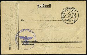 4076 | 16 € | 7140 LUDWIGSBURG : LUDWIGSBURG 1/ d 1943 (5.4.) 2K-Steg + viol. 1K-HdN: Jnst. Aktion A.(rmee) O.(ber) K.(do.) 6 Kdo. Ludwigsburg + hs. Abs.: "..Pz. Gr. E. Btl. 86, Marstall Kaserne", klar gest. Feldpost-Faltbf. (schwache Falten) mit Inhalt n. Schwabach | ![]() | |