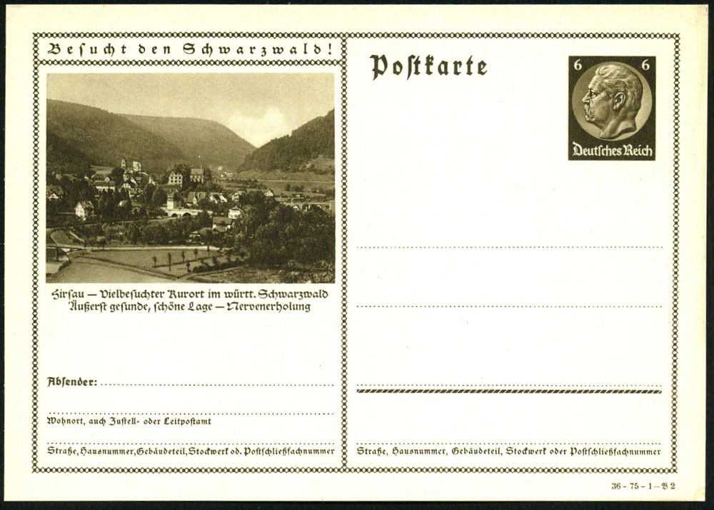 4284 | 10 € | POSTLEITRAUM 7200 (OHNE TUTTLINGEN) : Hirsau 1936 6 Pf. BiP Hindenbg., braun, Sonderform "Besucht den Schwarzwald!" (Orsbild) ungebr. (Mi.P 236/36-75-1-B2) | ![]() | |