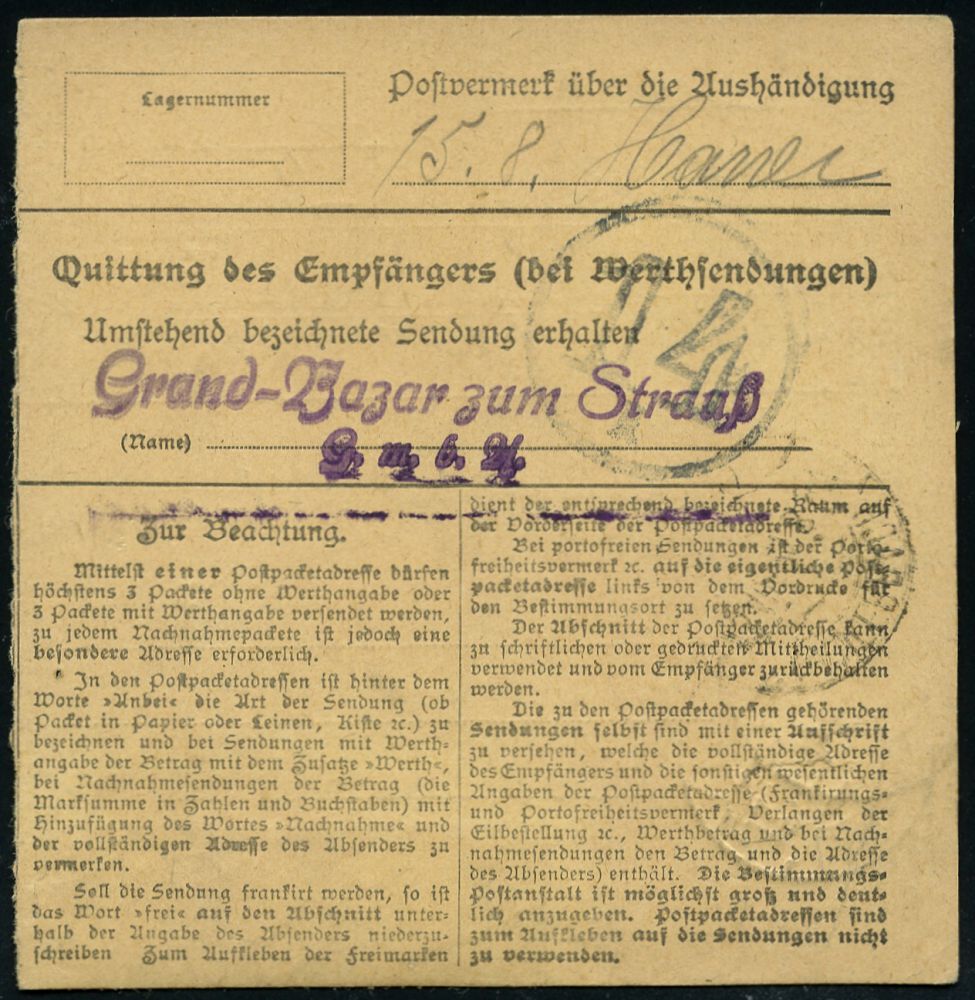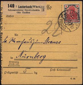 4287 | 20 € | POSTLEITRAUM 7200 (OHNE TUTTLINGEN) : Lauterbach(Württ.)/ Schwarzwälder Strohindustrie/ Otto Kurfess 1921 (13.8.) Selbstbucher-Paketzettel + 1K-Steg: LAUTERBACH/(Württ.) auf EF 4 Mk. Germania, seltene Inl.-Selbstbucher-Paketkt.! (Mi.153 EF) | ![]() ![]() | |